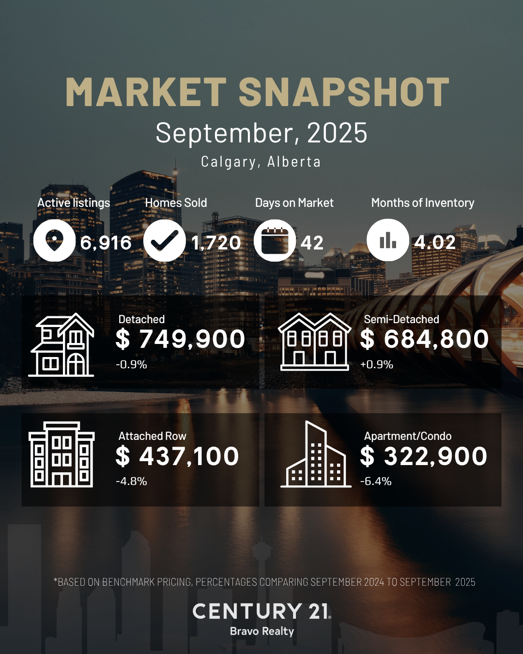 According to CREB®, 1,720 homes sold in September, down 14% year-over-year, while new listings climbed to 3,782, leading to 6,916 active listings across the city — the highest September inventory level since 2018.